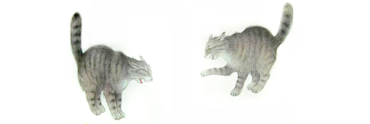 На рисунке Антоненкова серые, на вид одинаковые коты стоят напротив друг друга в боевой стойке: уши прижаты, когти выпущены, хвост трубой. И они явно угрожающе шипят и злобно фыркают. Мышей в стихотворении нет, но внизу на странице нарисованы три симпатичных мышонка, которые пьют чай с пирожными за круглым столом и даже как будто улыбаются, наблюдая за ссорой, а потом разбегаются по своим делам, совершенно довольные исходом драки.