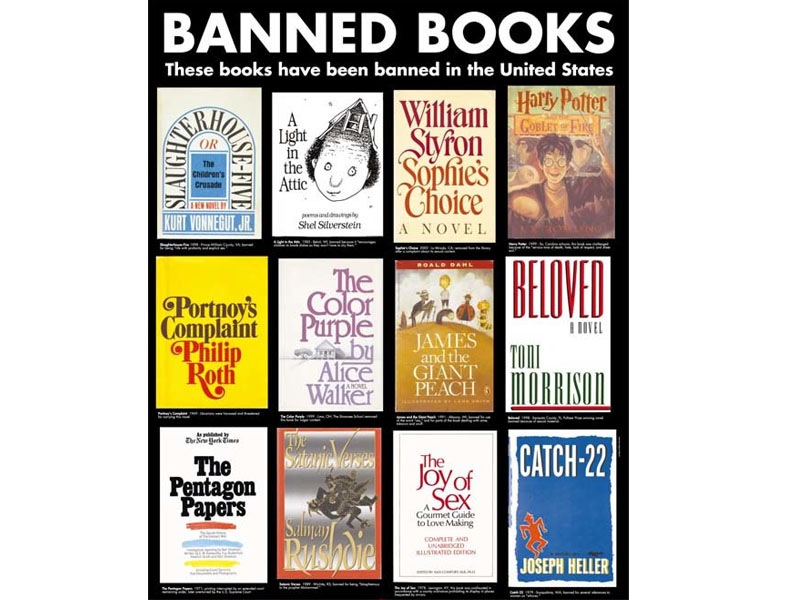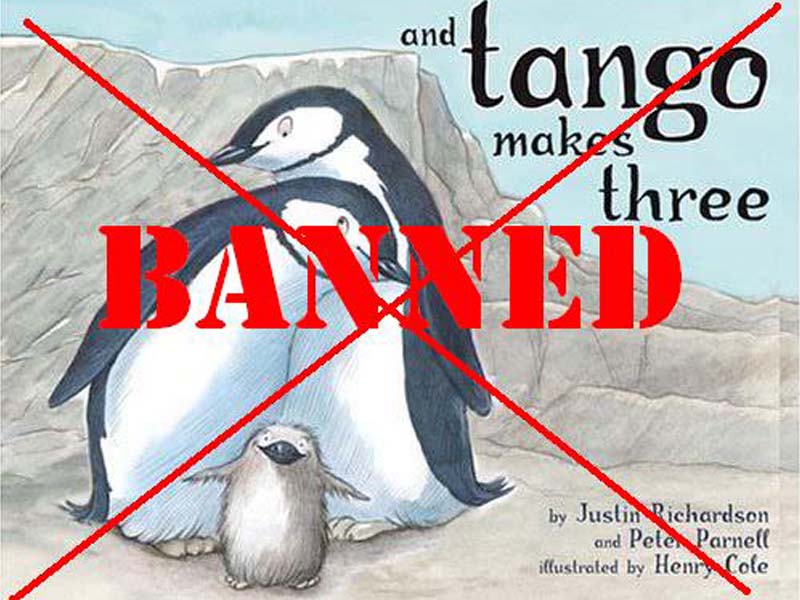 Книга «Танго танцуют трое» о жизни двух однополых пингвинов в зоопарке Нью-Йорка запрещена в 8 школах штата Висконсин. В Миннесоте, после неудачной попытки запретить «Танго танцуют трое», родители и учителя нашли компромисс: дети могут выбирать книги в школьной библиотеке только в присутствии одного из родителей. Книга Дори Батлер «У моей мамы будет ребенок», в которой маленькая девочка Элизабет, ожидающая рождения сестры, получает детальный ответ на вопрос «откуда берутся дети», запрещена в нескольких школах Техаса. Даже знаменитая повесть Артура Конан Дойля «Красным по белому» (в другом переводе «Этюд в багровых тонах») исключена из списка для чтения в шестом классе, так как представляет религию мормонов не в самом позитивном свете. В штате Вирджиния одна мама пожаловалась на присутствие гомосексуализма и секса в «Дневнике Анны Франк», что привело к решению комитета не задавать эту книгу в школе. Такое решение вызвало волну протестов, и в итоге книгу оставили в списке англоязычной литературы, но перенесли в списки для старших классов.