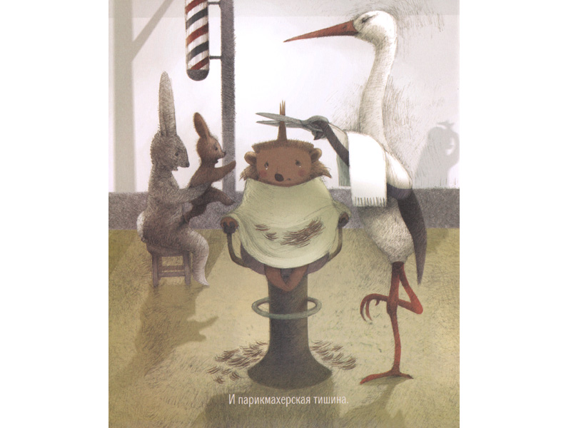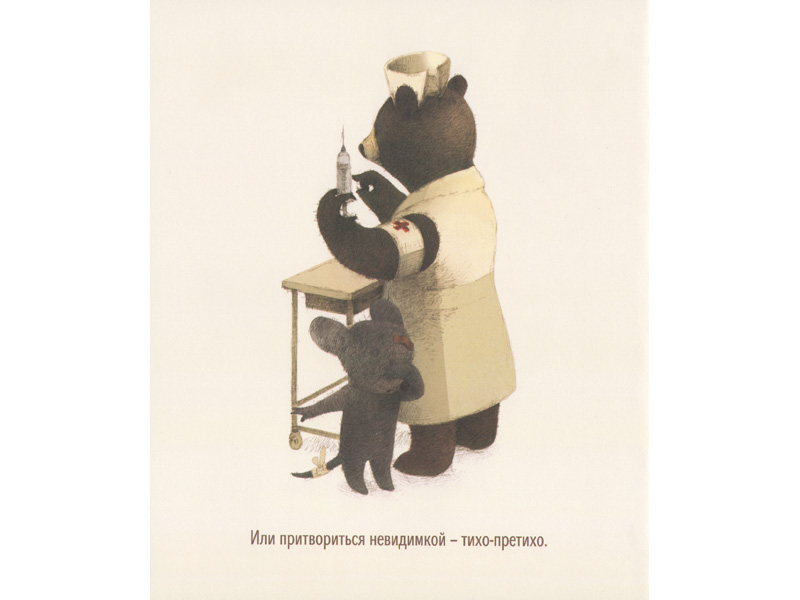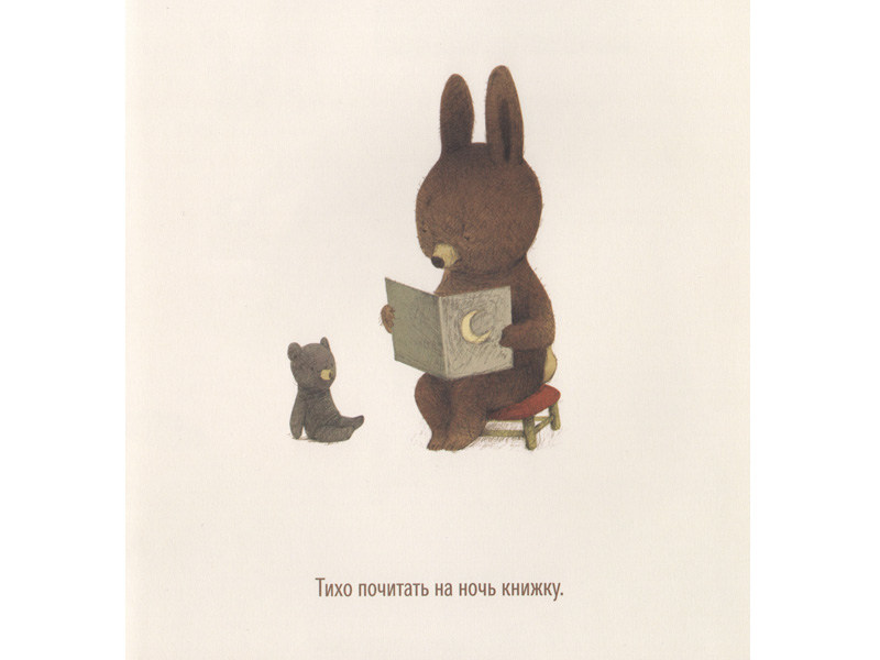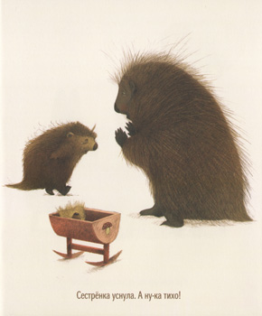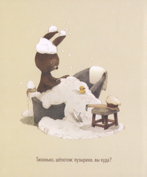 В «Тихой книге» подписи к картинкам иногда напрямую соответствуют тому, что нарисовано. Например: «Сестренка уснула. А ну-ка тихо!» Это мама (она все-таки больше похожа на дикобраза, чем на ежа) просит своего сына не шуметь, пока его младшая сестра спит в колыбели. На переднем плане – детская кроватка со спящим внутри маленьким лохматым существом. Иногда текст и картинка дополняют друг друга. На одной из страниц читаем: «Тихонько, шепотом: пузырики, вы куда?» Оказывается, зайчонок купается в ванне, и пена убегает через край, унося за собой резинового утенка и бумажный кораблик.
