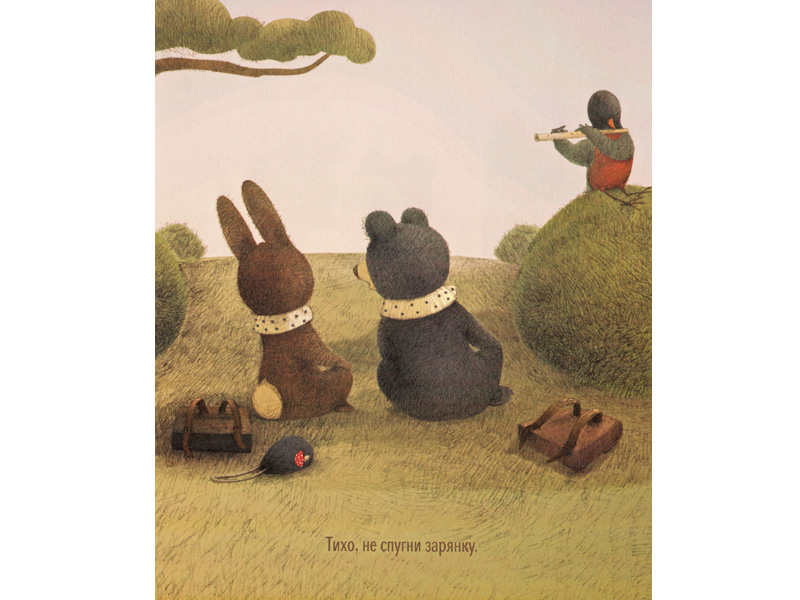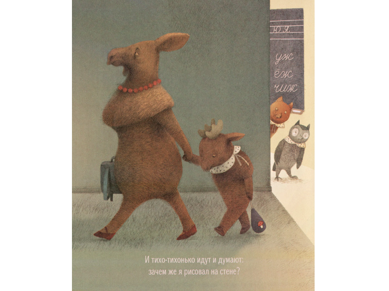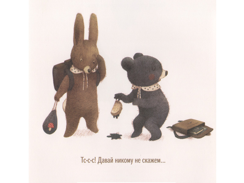 Например, читаем: «Тс-с-с, гости приехали! А что там в коробочках? Интересно…» И видим дородную зайчиху в нарядном платье и с игуаной на поводке (а ведь и правда, существует мода на экзотических домашних любимцев). Медведь в форменной одежде догоняет ее со свертками и коробками в руках. На следующей странице зайчонок, сын хозяйки дома, осторожно наклоняется к игуане, а та добродушно улыбается в ответ и предлагает поиграть теннисным мячом – и подпись: «Спрошу потихоньку: а игуаны кусаются?»