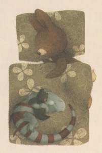 В конце книги эти герои появляются снова. Вот игуана и зайчонок, которые, видимо, успели подружиться, читают на ночь книжку при свете фонарика. Здесь написано: «Ну и что, что фонарик? Мы же тихо-о-онечко…» А потом они вместе засыпают, при этом игуана, свернувшаяся калачиком в ногах у зайчонка, прижимает к себе плюшевого медведя: «Тс-с-с! Мы спим!»