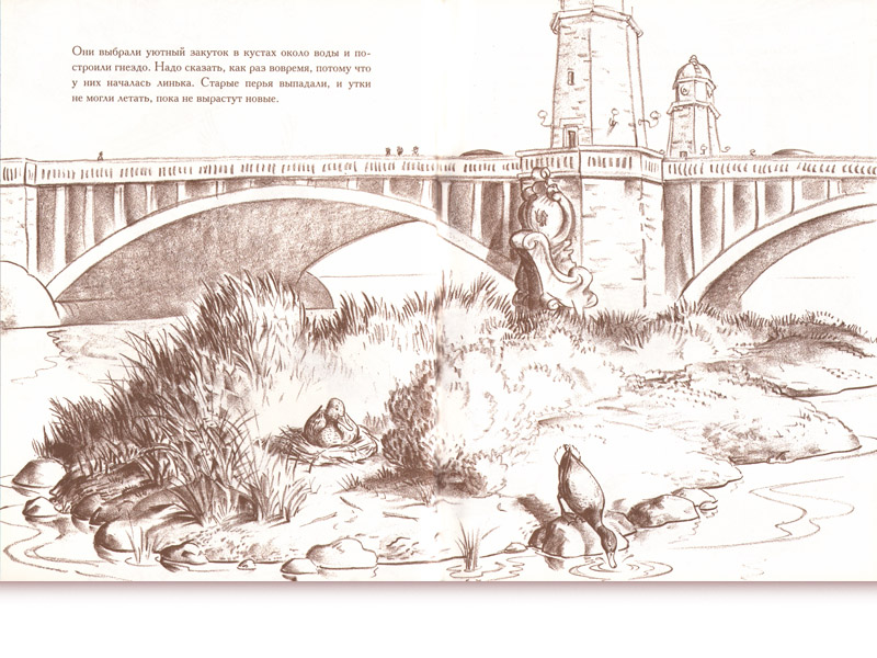 Всякий, кто живет в городе Бостоне, знает героев этой книги еще и по чудесному памятнику в центральном городском парке. Гордо вышагивает бронзовая мама-утка, а за ней торопятся, не поспевают восемь маленьких утят. Так о чем же книжка и как ее герои попали в этот парк?