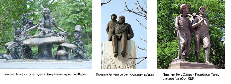 Другие авторы детских книг тоже удостаиваются памятников, например, Ивану Андреевичу Крылову и героям его басен стоят памятники и в Москве, и в Петербурге, а памятник Петру Ершову и его замечательному «Коньку-Горбунку» установлен в Тобольске. Памятник Антуану Сент-Экзюпери и Маленькому принцу есть в Лионе, а в Днепропетровске Маленький принц стоит на своей малюсенькой планете посередине фонтана.
