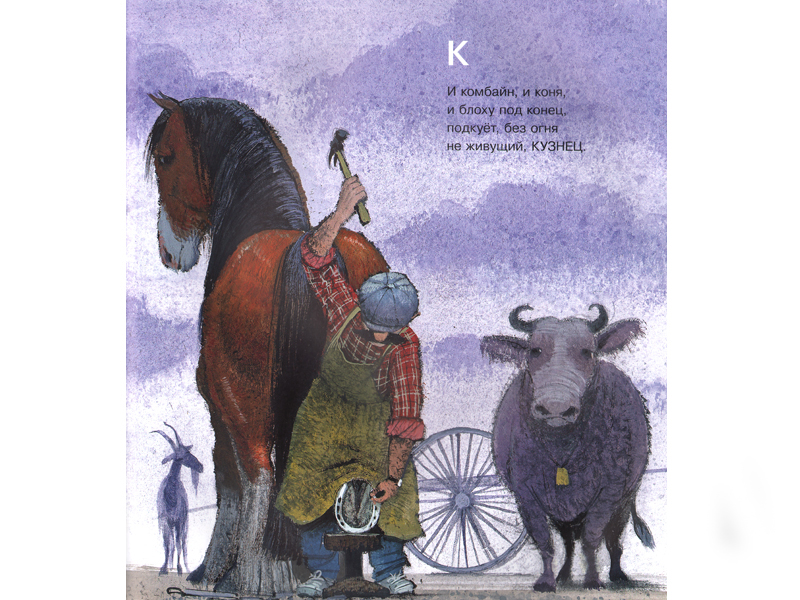 Оказалось, что эта необычная азбука вполне подходит для занятий с ребенком. Правда, изучение профессий (как, впрочем, и вообще чтение стихов) здесь отошло на второй план; в центре внимания оказались иллюстрации, которые часто параллельны тексту, и игра с буквами и словами.