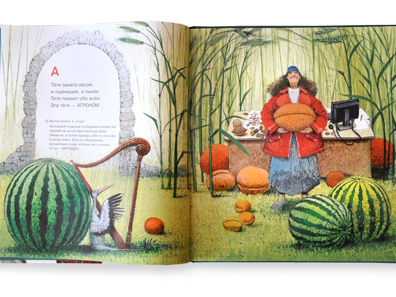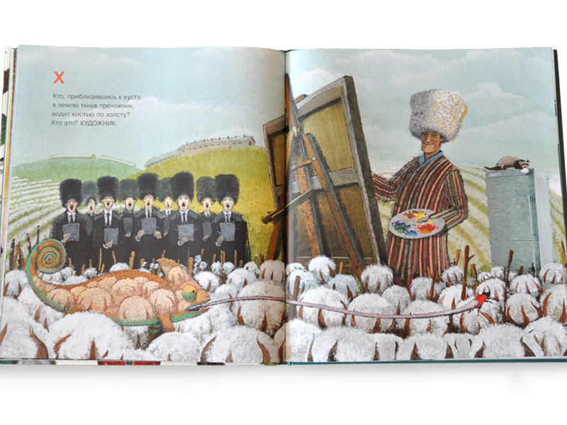 Иллюстрации, в которых нет никакой связи с личным опытом Федора и вообще нет ничего от реальности, мой сын изучал с неменьшим любопытством. Он воспринял их как веселую игру, в которой загадываются слова. Вот, например, на странице с буквой «З» трое зайчат под зонтиком от солнца едут верхом на зебре вдоль забора, на котором нарисована змея. А на странице с буквой «Р» рысь спит на радуге, раскинувшейся над морем, откуда рыбаки тянут сеть с пойманной рыбой и роялем – и все это под дождем из роз. Здорово!