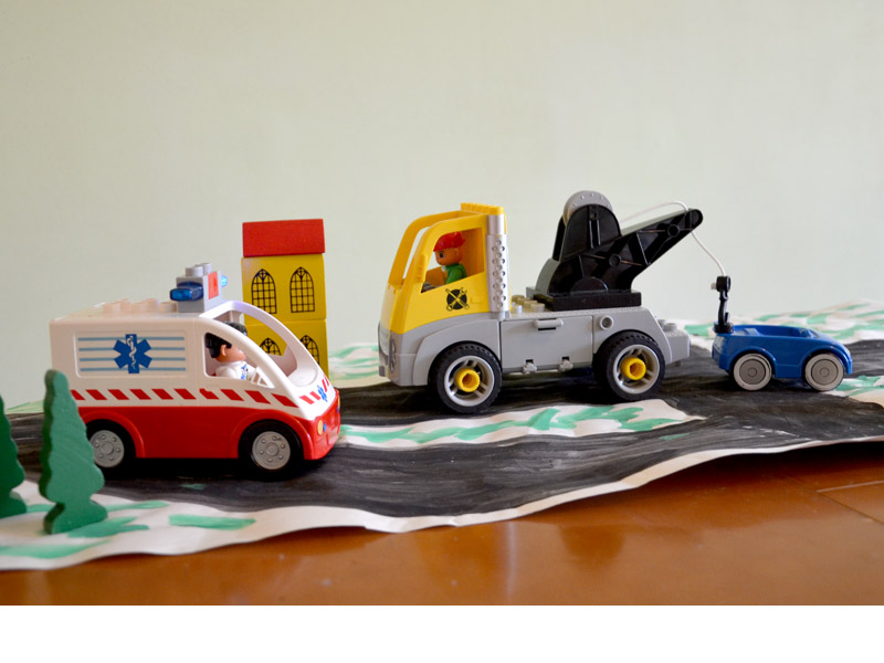 Потом мы проработали образы второстепенных персонажей: вот вихрем пролетел самолет над гоночной машиной, которая гордилась тем, что она самая быстрая; вот «прошелестели спицами худенькие велосипеды», посмеиваясь над большими и неповоротливыми автомобилями. И еще мы включили в спектакль сцены, где машины выполняют свою работу. В них нет слов, но много действия, которое сопровождается разными звуками: тарахтит работающий мотор, шуршат об асфальт шины, изредка гудит гудок, скрипят дворники, ревет сирена. И в заключение мы оформили сценическое пространство: размотали по столу рулон бумаги для рисования и изобразили на нем дорогу с перекрестком, светофором и пешеходным переходом.