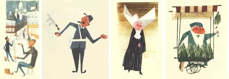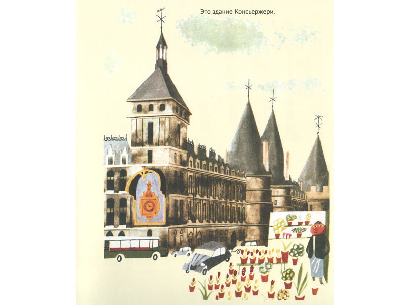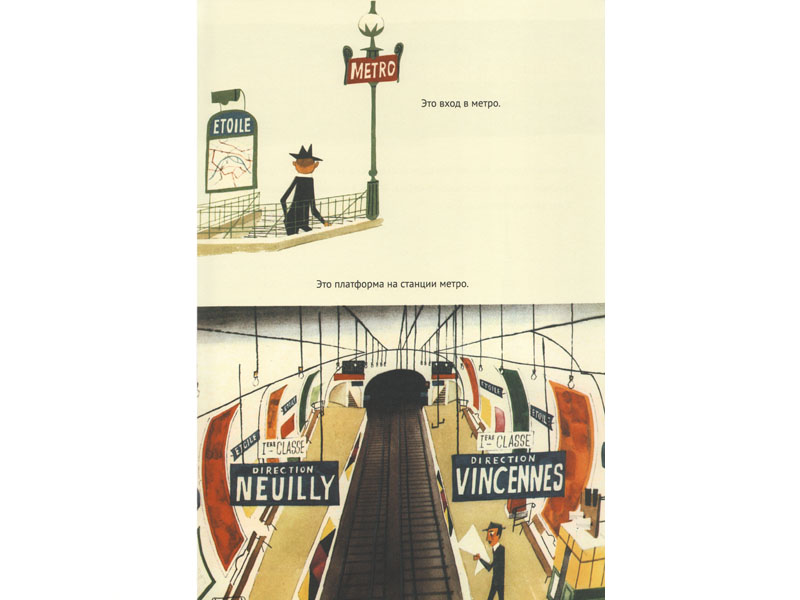 Мирослав Шашек родился в Праге, жил в Швейцарии. Он написал и сам проиллюстрировал восемнадцать книжек для детей о разных городах и странах. Париж у него получился веселый; на первом развороте панорама города похожа на пеструю картину пуантилиста Сера, а рассказ сразу начинается с того, что понятно любому ребенку – с кошек. Потом наступает черед людей – обитателей Парижа. А там уже и церкви, и дома, и метро с автобусом. И даже старый-престарый билетик метро нарисован.