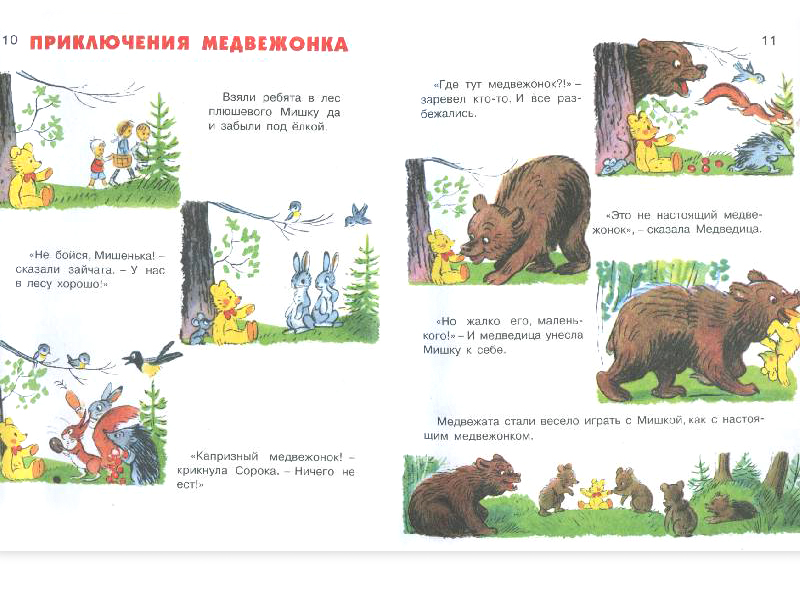 Большинство историй в ней – без текста. И очень интересно вместе с ребенком, картинка за картинкой, эти истории рассматривать. Подобных книг у нас еще не было. Было нечто похожее – задания в сборниках «развивалок», где нужно по рисункам рассказать историю. Но в этих заданиях нет жизни, они чересчур нарочитые. У Сутеева же всё легко и естественно.