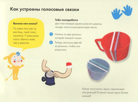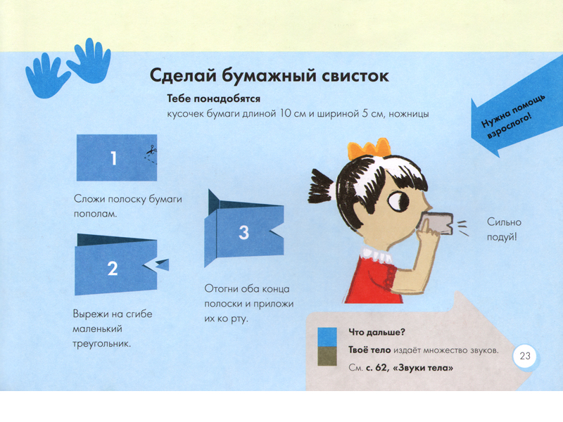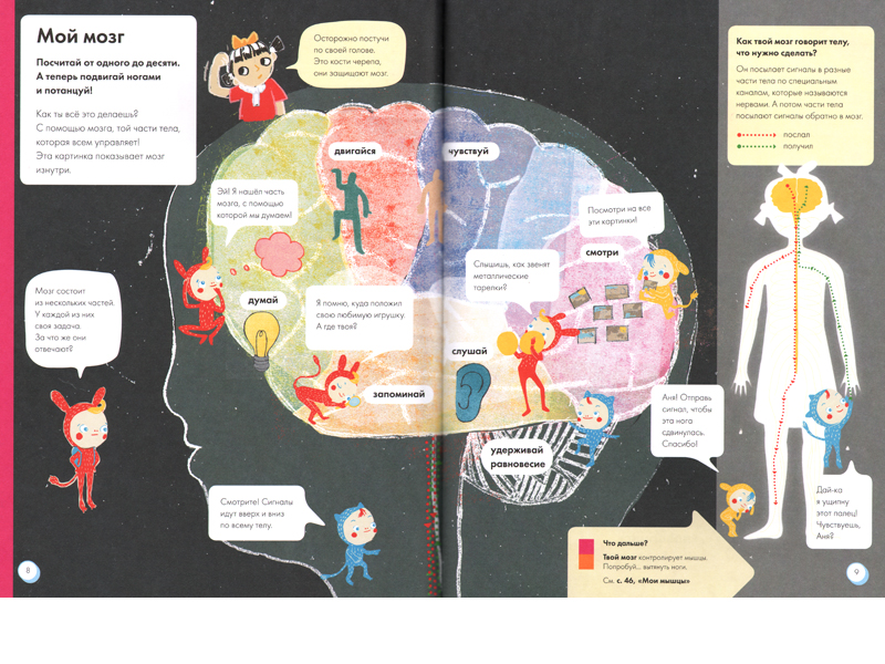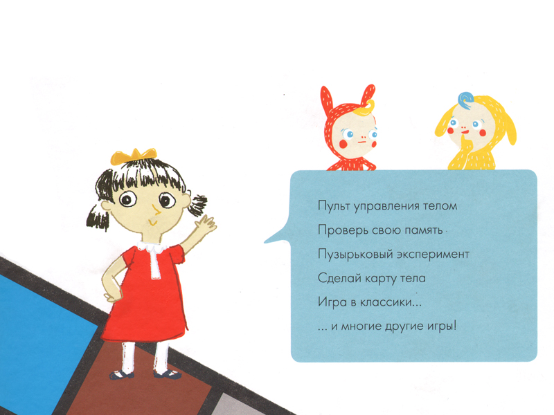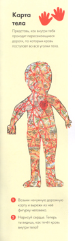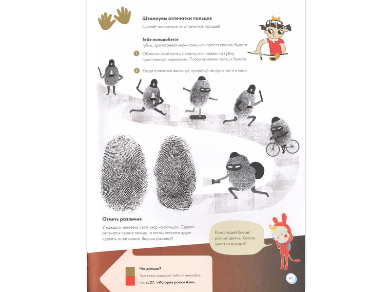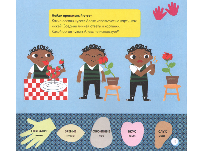 Есть тут всевозможные загадки и головоломки: например, найди на картинке все, что вкусно пахнет или сильно шумит; игры «Я вижу…», «Потрогай и угадай». Опыты и эксперименты: пощупай свои голосовые связки, поймай воздух из легких. Оптические иллюзии, помогающие понять, как устроено зрение. Игра в классики на асфальте, чтобы разобраться в работе мышц. Поделки из подручных материалов – например, карта своего тела…