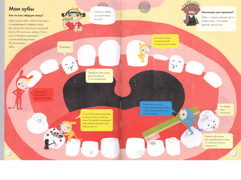Книга подготовлена британской дизайнерской студией OKIDO, которая специализируется на детских научно-популярных изданиях. И здесь нет привычных для нас многозначительных намеков и умолчаний. Наоборот, книга полна «страшных» слов. Целый разворот называется «Моча и кал». Маленьким читателям предлагается выяснить, почему моча иногда бывает светлой, а иногда темной (малыши с великим интересом разглядывают содержимое своего горшка, да вот только мамы обычно торопятся скорее избавиться от него). Определить, где на рисунке какашки кролика, где слона, а где – Ани, которая поела кукурузу. Заодно можно выяснить, почему люди пукают. Жуткая тайна открывается детям на этом развороте: «Взрослые иногда какают. Иногда они в это время читают. Даже дедушка какает!»