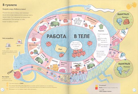 Это, прежде всего, игра. А что может быть нужнее и интереснее детям дошкольного возраста, чем игра? Чего здесь только нет! Сюжетно-ролевая игра «Пульт управления телом»: один участник играет роль «мозга» и с помощью самодельного картонного пульта управляет другим участником – «телом». Несколько настольных игр с фишками и кубиком. Одна из них называется «Работа в теле»: двигаясь по крупным клеточкам, малыш «разносит» еду разным органам, собирает отходы и… заканчивает игру в туалете.