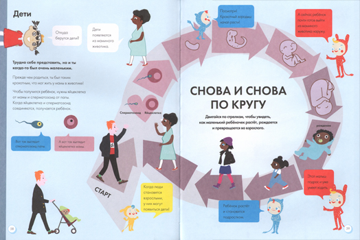Еще один разворот посвящен «круговороту детей в природе», как выразился один семилетний поклонник этой книжки. И тут есть слова «сперматозоид» и «яйцеклетка». Крупная, ясная и понятная схема со стрелочками показывает, как из маленького «головастика» получается зародыш, как он превращается в младенца, как тот начинает ходить, идет в школу, становится взрослым – и у него появляются собственные дети.