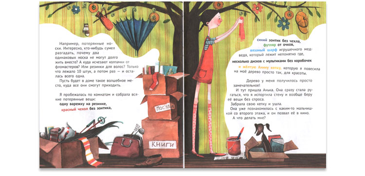 И еще она умеет всякие штучки придумывать. Придумала, например, «находчивое дерево»: на него можно вешать что угодно, любые попадающиеся на глаза вещи. (Это можно воспринимать как приглашение к совместной игре, спрятанное в книге.)
