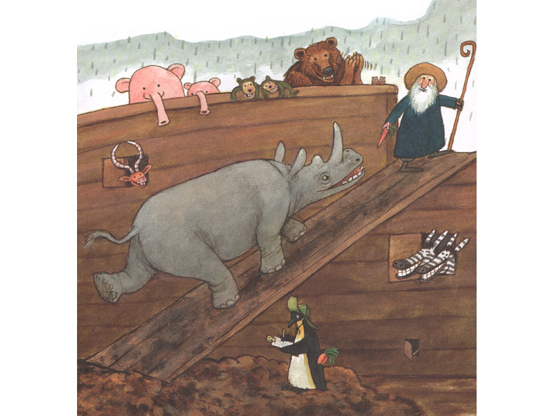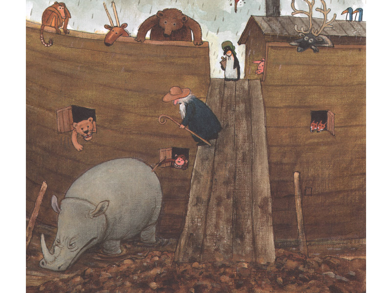 Примерно так же ведет себя Носорог из «Ноева ковчега» Нурдквиста. Небо заволокли тучи, льет дождь, приближается катастрофа. Ной собирает «всех тварей по паре» и устанавливает правила поведения: «На моем корабле все животные соблюдают мир. Здесь нельзя никого есть». Звери устраиваются, укладываются на корабле.