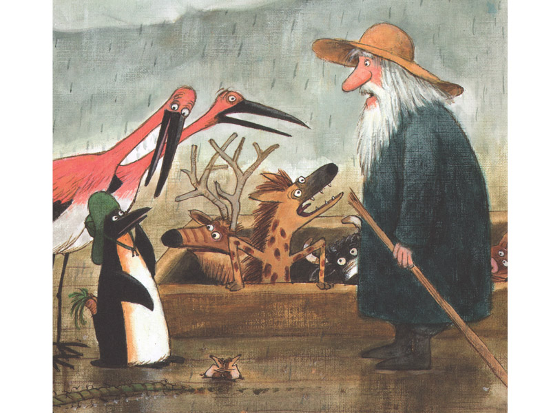 Писатель вовсе не стремится к историческим соответствиям. Его ковчег имеет мотор и трубы, мачты и паруса. Вход на ковчег – строго по очереди, которую контролирует Королевский Пингвин. Поиском земли занимается вовсе не голубь, а божья коровка, которая – примечательная и запоминающаяся деталь! – путается в волосах старика Ноя. Кстати, а почему именно божью коровку просит Ной «слетать к Господу и узнать, нет ли у него хорошей погоды»? Не потому ли, что в названии этого насекомого даже ребенок услышит связь с Богом?