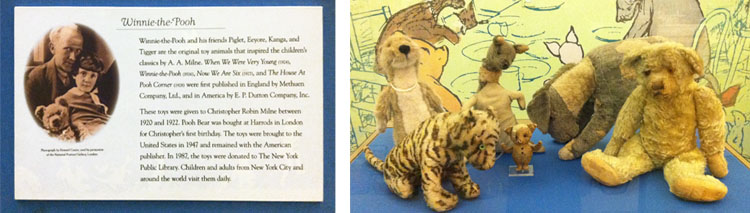Эти игрушки были подарены библиотеке в 1997 году. Их привезли в США после Второй мировой войны. Издательство возило их по стране и показывало вместе с новым изданием книги. Так они и остались в США. У самого Кристофера Робина Милна было к ним двойственное отношение. Эти игрушки много раз чинились ‒ очевидно, мальчик их очень любил, и они подсказали его отцу идею книжки. Но когда Кристофер подрос, его отношение к игрушкам изменилось, потому что из-за них его дразнили в школе. В конце концов игрушки были подарены нашей библиотеке. Здесь их могут увидеть все, и это бесплатно.