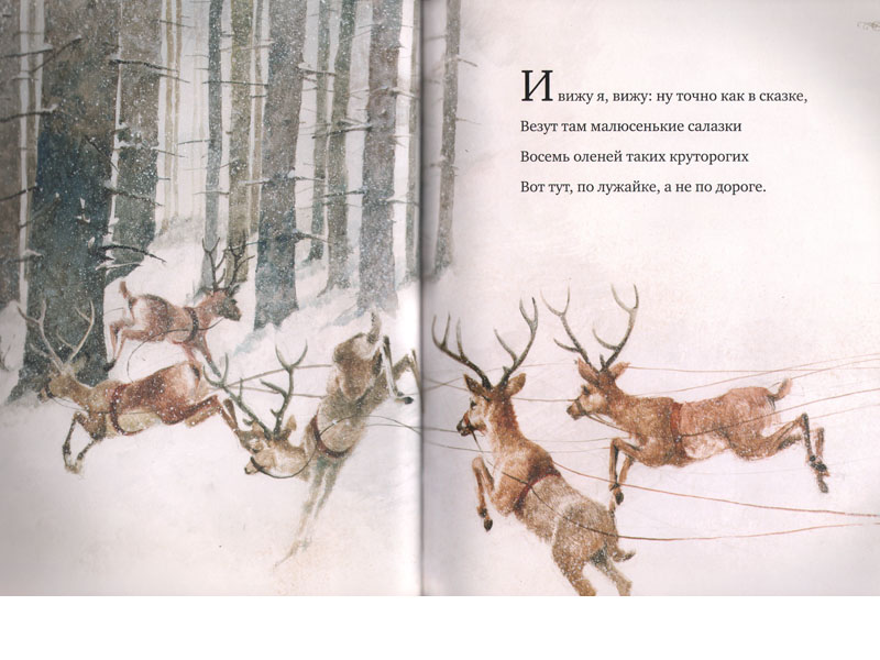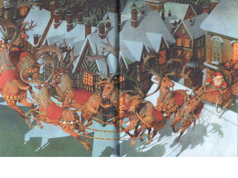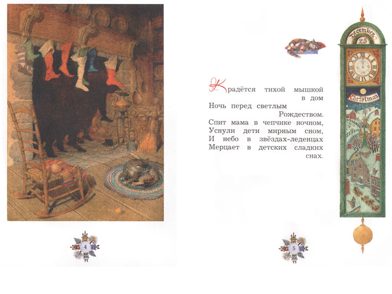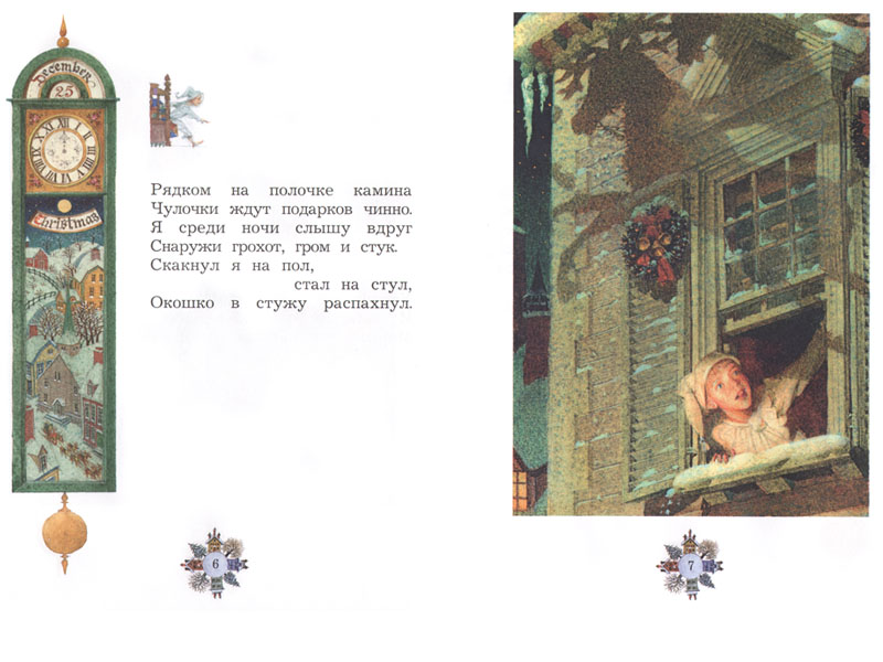 Первые его переводы на русский появились еще в XIX веке и продолжают появляться сегодня под различными названиями: «Рождественская ночь», «Ночь перед Рождеством», «Рождество». Множатся и иллюстрации к тексту. Два русских издания баллады Мура сопровождаются работами Геннадия Спирина и Роберта Ингпена. Как и выбор перевода, выбор художника – дело личного вкуса читателя. Санта-Клаус Ингпена кажется веселым и жизнерадостным хитрецом. Герой Спирина чуть серьезнее, за ним явно угадывается русский Мороз. Но оба художника замечательно передают удивительную рождественскую атмосферу – ожидание чуда, волшебство: слышите, уже застучали по крыше копытца оленей?
