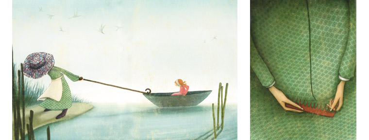 Иллюстрации современной итальянской художницы Мануэлы Адреани – еще одна интересная интерпретация классического текста изобразительными средствами. Эти иллюстрации выполнены в узнаваемом анимационном стиле: кажется, картинки в книжке вот-вот начнут двигаться, превратятся в мультфильм. Персонажи похожи на кукол, но сделанных из «необычных материалов». Они двигаются иначе, чем реальные люди, им не свойственна прозаическая «сила тяжести». И эта особенность движения в сочетании с особой «сновидной» организацией пространства сразу создает сказочное ощущение.