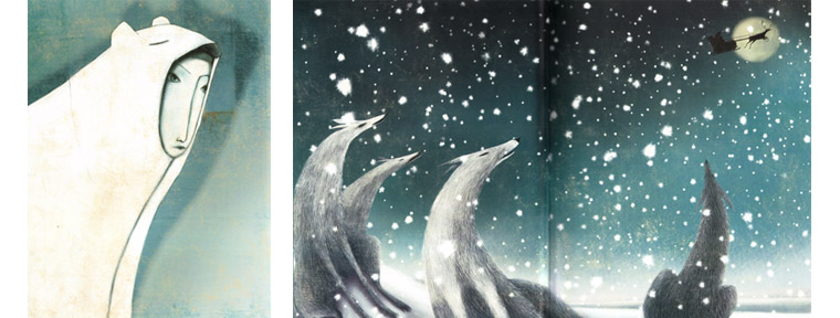 У Снежной королевы, созданной Мануэлой Адреани, нет никаких привычных королевских атрибутов – ни богато украшенной одежды, ни короны, ни мехового головного убора. Она укутана во что-то среднее между стилизованной шкурой белой медведицы с разинутой пастью, паркой (традиционной одеждой северных народов) и белым саваном, в который обряжают покойников. И лицо ее трудно назвать красивым или некрасивым. Это лицо существа из иного мира ‒ ничего не выражающее, с прочерченными словно по снегу линиями губ, бровей и носа и застывшим взглядом глаз-льдинок. Мертвое – прежде всего бесчувственное, лишенное красок жизни. И белизна Снежной королевы легко обращается в черноту. В книге есть совершенно завораживающая иллюстрация, на которой призрачные остромордые волки следят за полетом саней Снежной королевы. Волки тут выступают как посредники между двумя мирами, как верные слуги смерти. Их гротескно вытянутые морды обращены к летящим по ночному небу саням. И на фоне бледной луны сани с сидящими в них седоками кажутся совершенно черными.