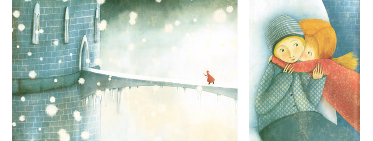 Путешествие Герды в замок Снежной королевы в интерпретации Мануэлы Адриани оказывается проникновением в царство мертвых. На одном из разворотов, где нет текста (таких разворотов, предназначенных исключительно для рассматривания, в книге несколько), Герда идет по узкому ледяному мосту к замку. Мост нависает над пропастью, над пустотой. Сторожевая башня замка «смотрит» на Герду слепыми обледеневшими глазами-бойницами. А фигурка Герды – пульсирующее розовато-красноватое пятнышко в царстве мертвенно-белого и серо-голубого. Надо сказать, что на Герде от начала и до конца истории одежда одних и тех же теплых оттенков – розовато-красноватых. На картинках Герда всегда излучает тепло, которое ощущается чуть ли не физически. Если Снежная королева – сама смерть, то Герда – сама жизнь, которая для Андерсена движима любовью. И когда Герда наконец находит в ледяном замке своего Кая и бросается обнять его, цвет становится пылающей метафорой ее горячих слез, растопивших лед, в который было превращено сердце мальчика.