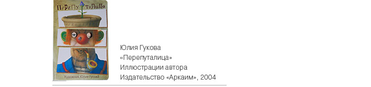 «Перепуталица» – книжка-игрушка, автором которой является художница Юлия Гукова. Конечно, картинки к книжке-игрушке нельзя сравнивать с ее же виртуозными иллюстрациями к «Великому чародею страны Оз» или «Приключениям Алисы в Стране чудес». Но даже в этой книге без текста художница играет смыслами и тонко провоцирует воображение читателя, балансируя на грани реального и нереального. Ироничность, таинственность и притягательная странность ‒ характерные особенности стиля Юлии Гуковой.