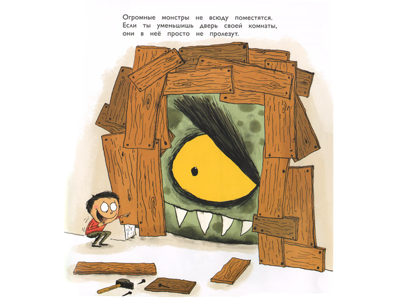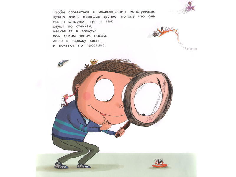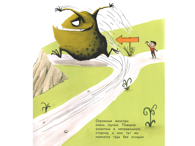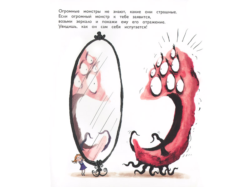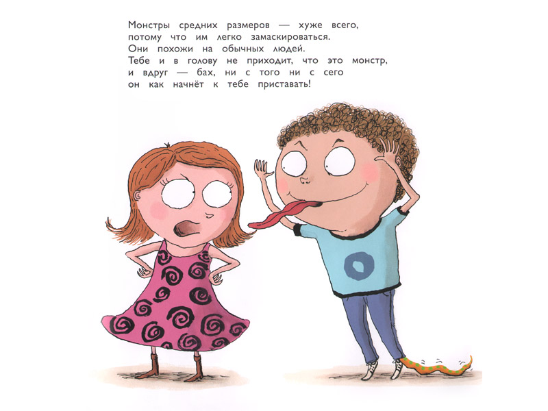 Что касается пятилеток, то они, скорее всего, будут любить книгу за другое – именно за предложенную классификацию и за сообщение о том, что монстров (страхи) в принципе можно одолеть. Но предлагать эту книжку пятилетнему ребенку нужно осторожно. Если она вдруг вызовет отторжение, нежелание «общаться» с ней, нельзя настаивать на чтении. Нельзя даже обещать, что «будет интересно». Нужно помнить: ребенок, который еще не вооружен достаточно развитым чувством юмора, может испытать неприятные ощущения и даже испугаться.