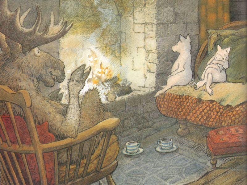 Поросята слегка удивляются, обнаружив в своем домике нежданных гостей. Но автор сразу объясняет нам, что вообще-то ничего страшного в таком госте нет. Один из поросят «дружил со многими медведями в лесу». Другой «не боялся лосей и дружил с ними». Не с данным, конкретным медведем или лосем, а с лосями и медведями «вообще». Как часто говорят дошкольники, «я люблю играть с друзьями». «Друзья» ‒ это те, кого можно встретить в песочнице или в каком-нибудь игровом модуле во дворе. И нет никаких оснований относиться к ним с подозрением или агрессией. Это потенциальные партнеры по игре. А играть с кем-то во дворе гораздо интереснее, чем одному.