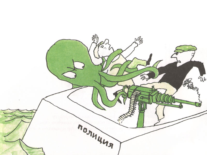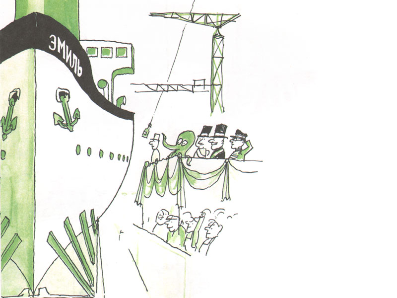 Дальше, как всегда у Унгерера, герой совершает подвиг. Эмиль обнаружил и обезвредил контрабандистов, и в его честь назвали новый патрульный корабль. До недавнего времени в правдоподобии таких немыслимых приключений Федор нисколько не сомневался. Наоборот, он всякий раз придумывал собственную историю, которая заканчивалась полным торжеством Эмиля. Но в этот раз знания Федора об осьминогах вступили в противоречие со сказкой. Мы прочитали, что осьминоги очень осторожны и даже пугливы: большую часть жизни они проводят в укрытии, ловят добычу из засады, а от врагов спасаются бегством. А в этой истории Эмиль не только добрый, но и отважный осьминог.
