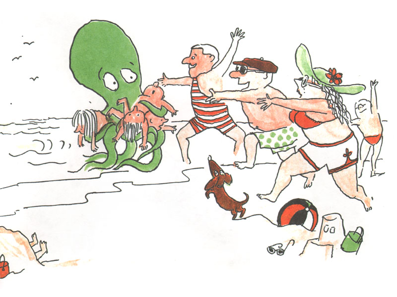 Но Эмиль все-таки скучал по океану и начал работать спасателем на пляже. Федор согласился, что, имея восемь гибких и ловких щупалец с присосками, очень удобно спасать людей, которые слишком беспечно ведут себя на воде. Он также посоветовал Эмилю обзавестись свистком и оранжевыми трусами, которые после нашей летней поездки на море считает обязательными атрибутами спасателя.