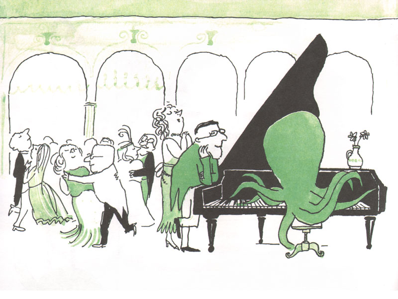 У Эмиля обнаружились разные таланты. Он стал музыкантом-мультиинструменталистом. На рисунке изображено, как он одновременно играет на арфе, контрабасе и ударной установке. До этого в энциклопедии мы прочитали, что осьминоги – одни из самых умных животных среди беспозвоночных и имеют развитый слух. Поэтому Федор остался вполне доволен тем, что Эмиль с успехом дает концерты.