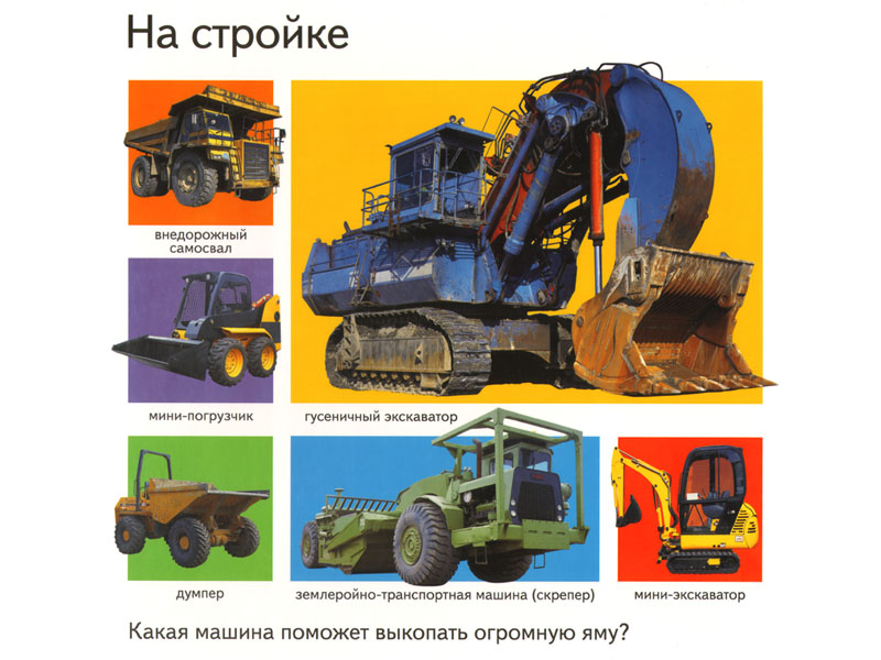 А еще на каждой странице есть вопрос на «сообразительность»: «Какая машина может выкопать огромную яму?» (нужно выбрать картинку с соответствующим экскаватором), «У какой из этих машин черный ковш?» (здесь нужно не только в цветах разбираться, но и понимать значение слова «ковш»), «Какая машина увозит мусор на свалку?» (мусоровоз на картинках выглядит одним из самых достойных видов транспорта), и т.п.