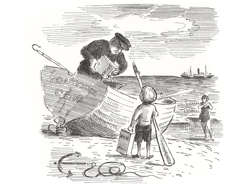 Вот перед нами замечательный пейзажный разворот-марина: морская гавань в ясный солнечный день, рисунок словно лучится той радостью предвкушения приключений, которая кипит в душе отправляющегося в плавание Тима. Но что мы видим на первом плане? Обломки такелажа, следы былого кораблекрушения... Нет, настоящее морское плавание ‒ это вам не веселая прогулка! Так детская беспечность уравновешивается взрослым опытом, и дети прекрасно считывают подтекст, добавленный художником. Рассматривая картинки, они сами делают правильные выводы. Такие уроки прочнее.