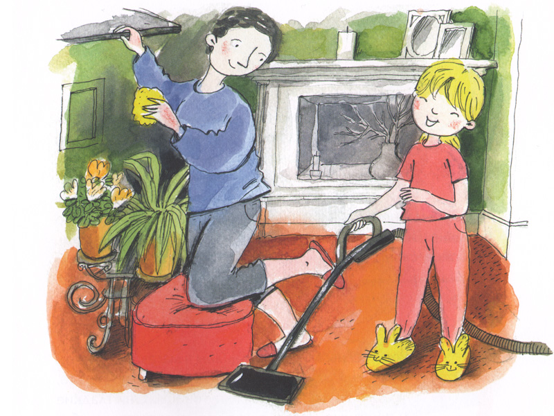 Начинаем читать. Мы вместе с героиней книжки проживаем несколько эпизодов из ее повседневной жизни. Домашние прятки, поход в музей, приготовление торта, прием гостей... Все буднично и знакомо, но дети слушают очень внимательно, улыбаются, часто хихикают. Всех очень смешит идея «слонотрясения», которое могло бы случиться, если бы слоны умели прыгать.