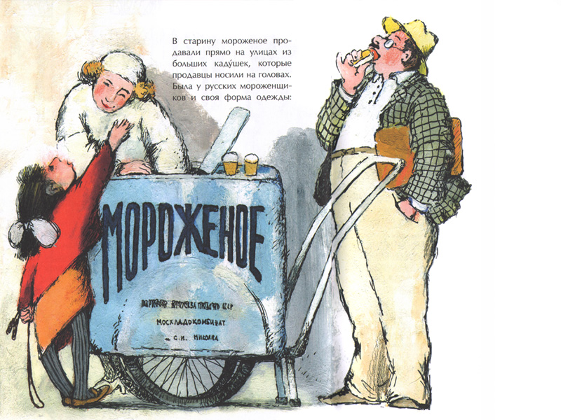 А уж потом чудесное кушанье пошло гулять по белу свету и, в конце концов, добралось до России. Как выглядели русские мороженщики, тоже описанные в книжке, мы все знаем по замечательному стихотворению Самуила Маршака и чудесным иллюстрациям Владимира Лебедева:
