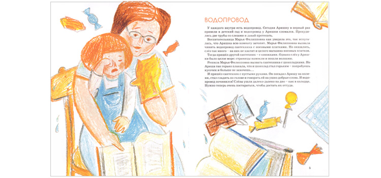 С чего начинается детсадовская жизнь? Честно признаться, со слёз. Поэтому вполне объяснимо, что первая история в книге называется «Водопровод». Аришку впервые привели в детский сад. И Аришкин водопровод (а такой есть внутри каждого человека) сломался. Стал протекать – да так, что целое море слёз образовалось. Пришли сантехники – один с книжками, другой с шоколадками; ничего не помогает. А потом пришел сантехник с пустыми руками (воспитательница Мария Филипповна). Он посадил Аришу на колени, стал по голове гладить и говорить ей на ушко добрые слова. И водопровод починился! Слезы высохли.
