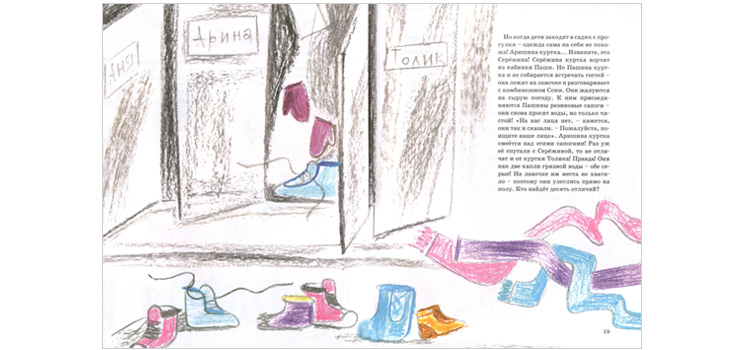 Целый день в детском саду... Анна Анисимова, с одной стороны, описывает каждую ситуацию очень узнаваемо и реалистично, а с другой – наполняет повседневные бытовые подробности красивой и умной, по-настоящему детской фантазией. Дети не просто рисуют березы из черных и белых полосок – они делают из своих рисунков целый березовый лес и пьют березовый сок. Не просто лепят куличики в песочнице, а ищут сокровища тайного замка (старые бусы воспитательницы). И даже трудное переодевание после прогулки, борьба с пуговицами, шнурками, застежками заканчивается веселой болтовней шарфов, шапок и варежек со своими хозяевами.