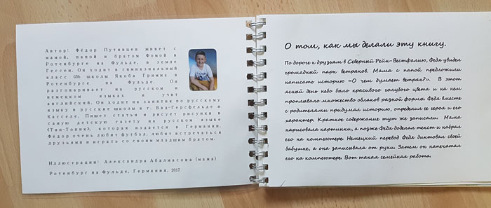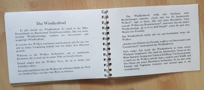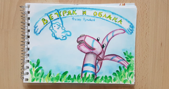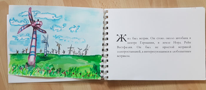 «По дороге к друзьям в Северный Рейн-Вестфалию Федя увидел громадный парк ветряков… В этот ясный день небо было красивого голубого цвета, и по нему проплывали облака разной формы. Федя вместе с родителями придумал историю, определил ее героя и его характер. Краткое содержание тут же записали. Мама нарисовала картинки, а позже Федя доделал текст и набрал его на компьютере. Немецкий перевод Федя диктовал своей бабушке, а она записывала текст от руки. Затем Федя напечатал его на компьютере...»