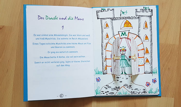 «В первом классе Вероника научилась писать и стала записывать сказки и истории. В одном из блокнотиков появилось начало этой сказки, написанное красивыми прописными буквами, хоть и с грамматическими ошибками. Но у сказки не было концовки… Через пару лет Вероника дописала сказку и набрала текст на компьютере. И тут нам предложили участвовать в конкурсе самодельной книги… Мы все увлеченно включились в работу. Вероника перевела сказку на немецкий язык и вместе с мамой начала рисовать к ней иллюстрации, папа помог распечатать текст, а дедушка - скрепить листы в книгу…»