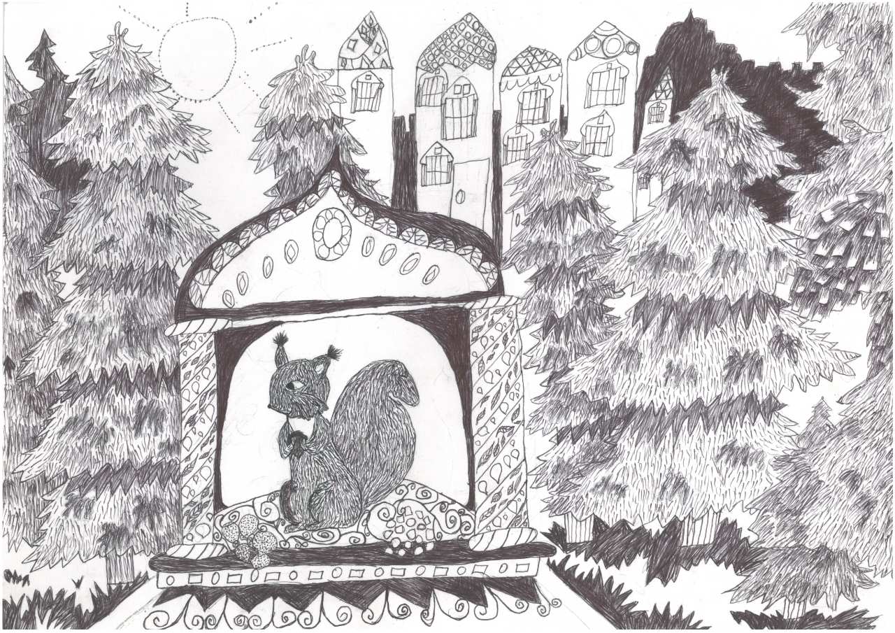 Изостудия " Диво" ДДЮТ г. Донецка . Руководитель Легостаева Л. П. Техника - графика . Персонаж книги " Сказка о царе Салтане" А.С.Пушкин. картина " Белка"