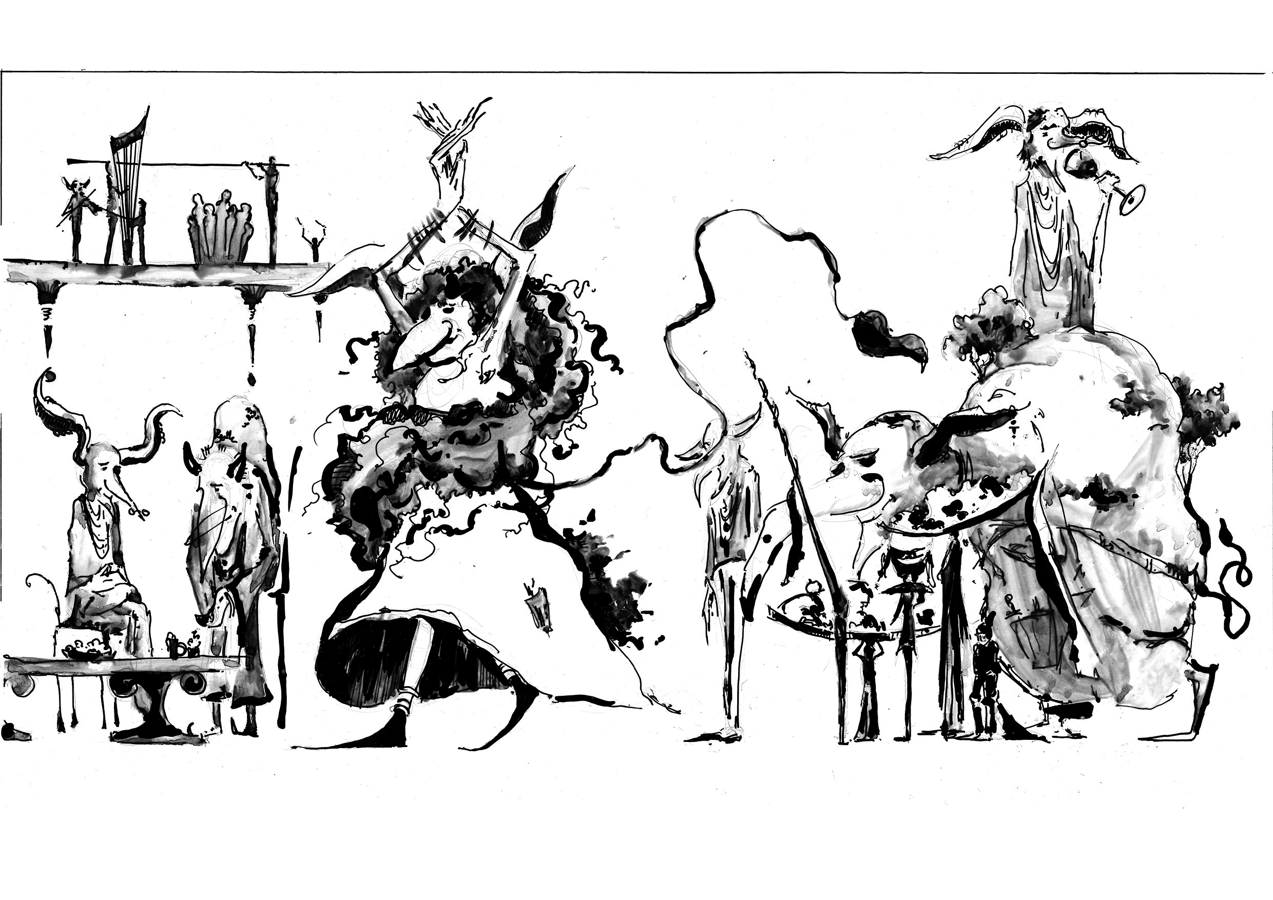 Через тёмные горы и леса со всех сторон тянулись к замку вереницы странных существ. Некоторые были такие старые, что поросли мхом и кустарником, другие были и того старше, да такие скрюченные, что походили на корни сосен. Они уж и идти сами не могли, их приходилось нести. Кругом всё гремело и звенело, дышало и фыркало: все хотели на пир, в это золото и блеск, в сияющий замок, дворец Сория-Мория, дрожащий от шума голосов.