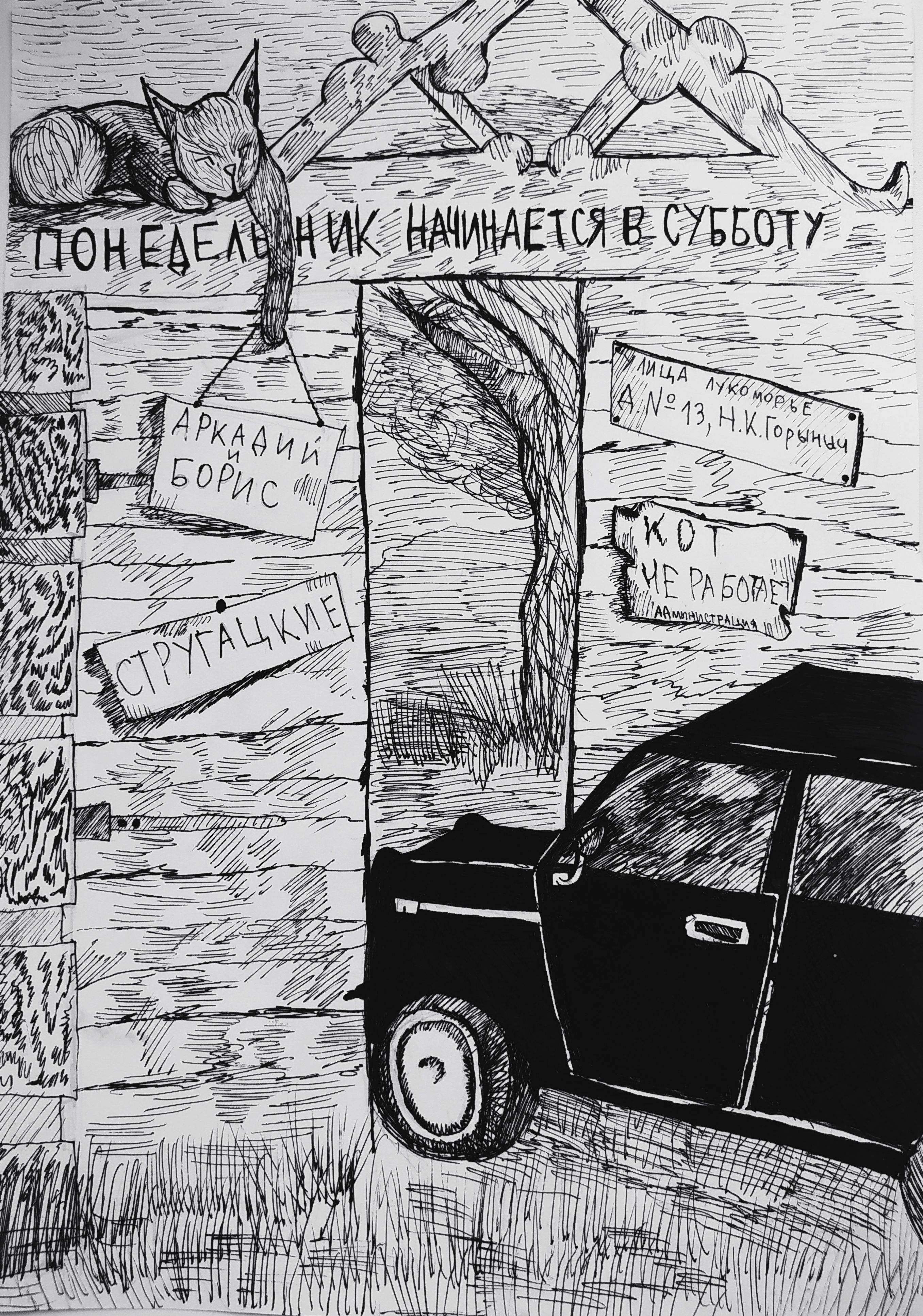 На правой воротине сверху висела ржавая жестяная табличка: "Ул. Лукоморье, д. N_13, Н. К. Горыныч", а под нею красовался кусок фанеры с надписью чернилами вкривь и вкось: