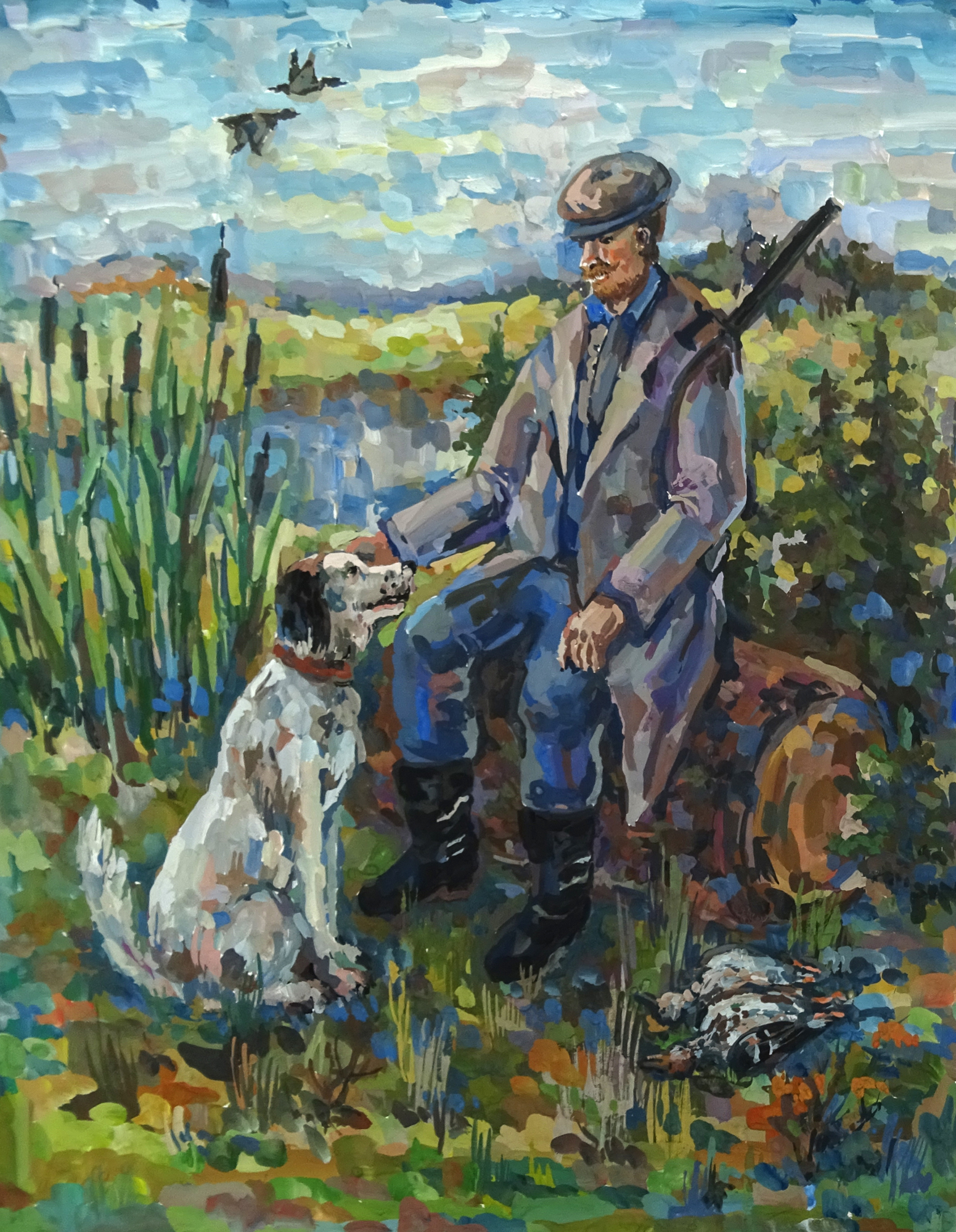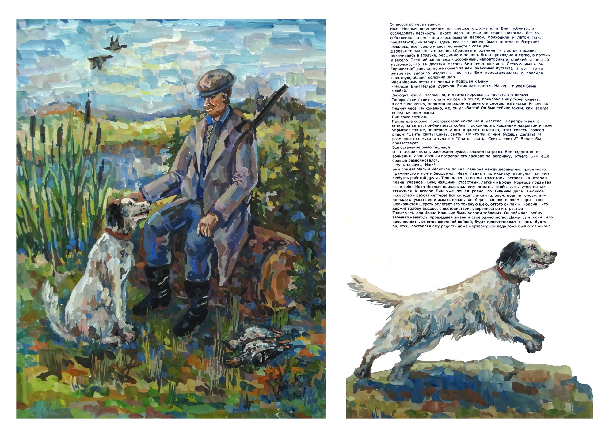 "Теперь Иван Иваныч опять же сел на пенек, приказал Биму тоже сидеть, а сам снял кепку, положил ее рядом на землю и смотрел на листья. И слушал тишину леса. Ну конечно, же, он улыбался! Он был сейчас таким, как всегда перед началом охоты.
