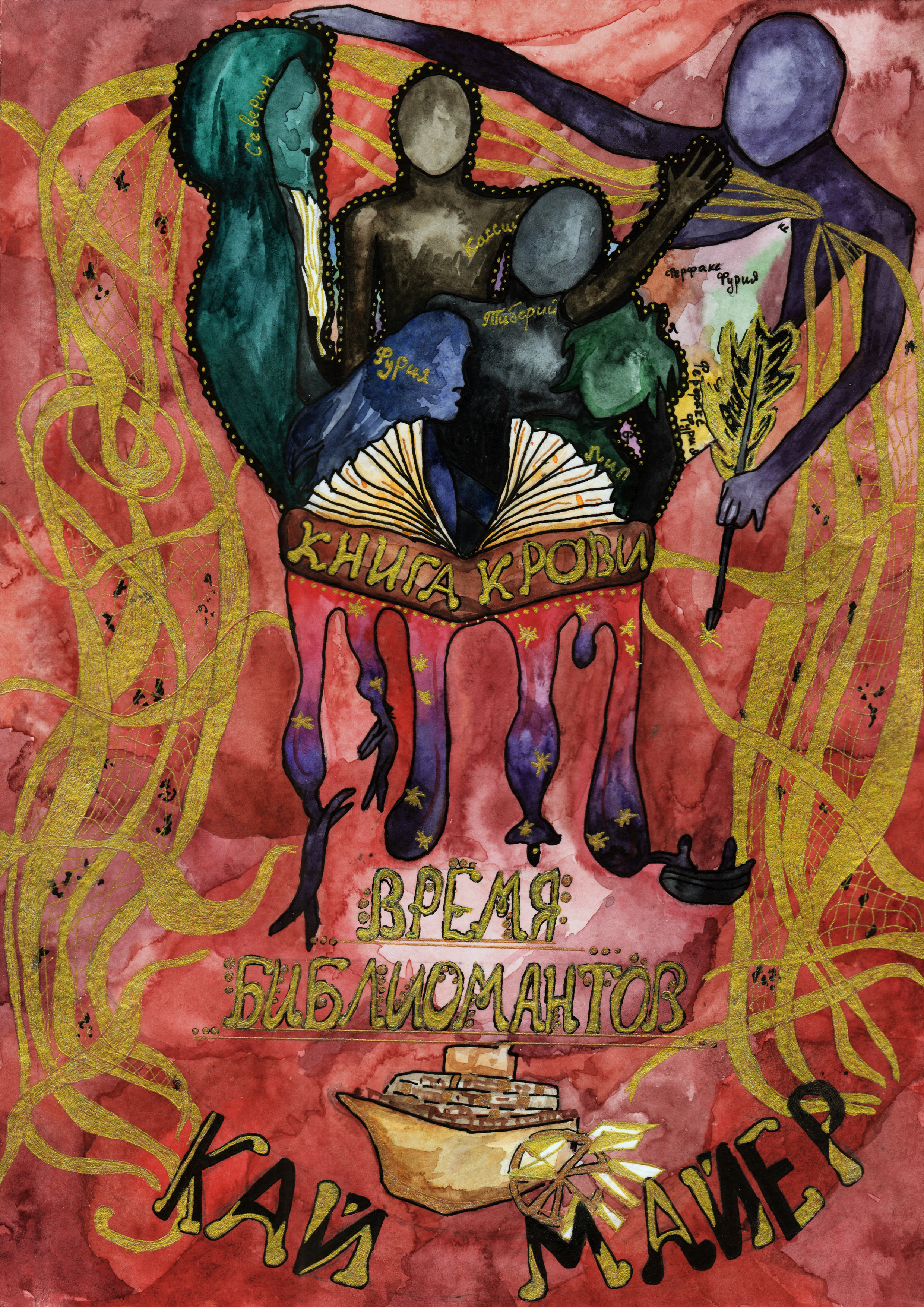 Большая часть верха рисунка посвящена моей интерпретации названия книги. Как это часто бывает, понятие о крови используется писателями не для подчёркивания тёмных, мрачных, неописуемо ужасных событий (хотя бывает и такое) в сюжете истории, а для выражения связи между людьми. Кровной связи. То есть семейных уз. Это книга о приключениях главной героини, потомка семейства Розенкрейц, а значит книга крови этой семьи ещё не завершена. Именно это я и постаралась изобразить в верхней части рисунка. Тёмные фигуры разных оттенков обозначают действующих лиц этой семьи, отображённых в книге. Они – часть одной книги крови.