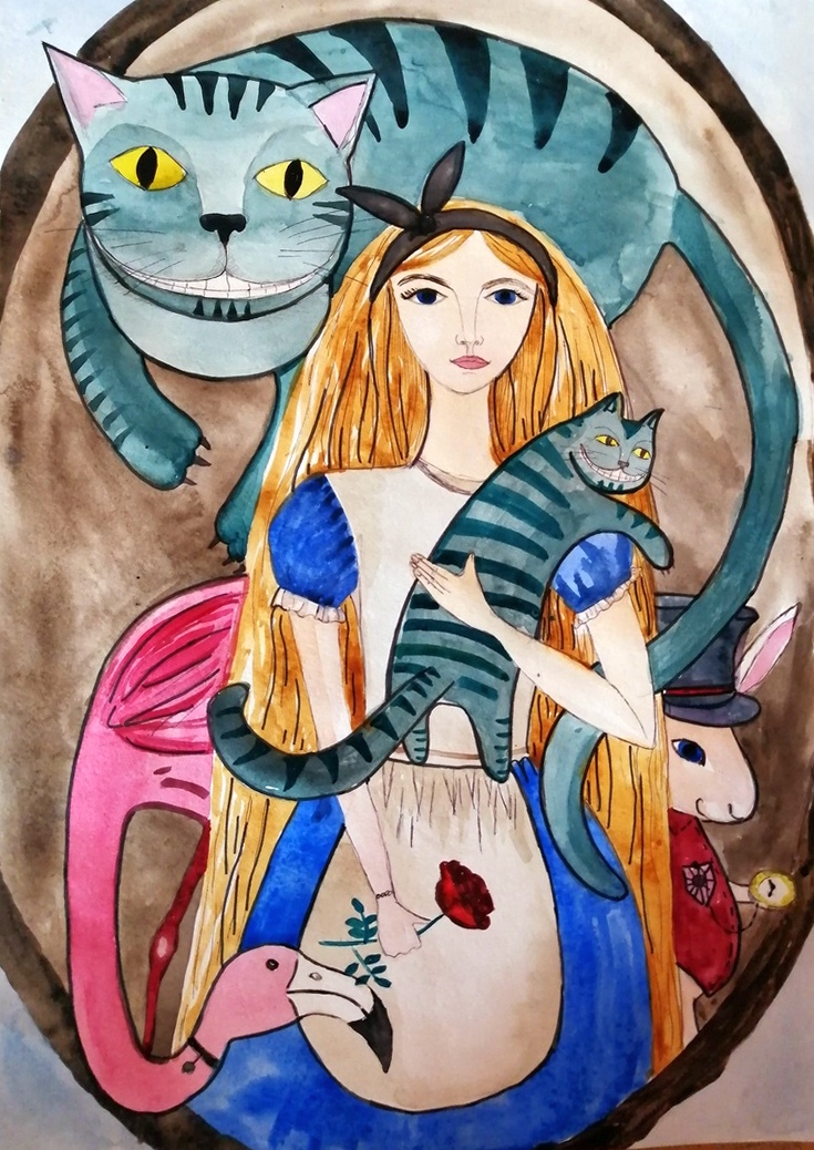В первой книге Алиса видит пробегающего мимо белого кролика с часами, которые он вынимает из кармана, и вслед за ним прыгает в нору, откуда длинный туннель приводит ее в Страну Чудес. Там Алису ждут невероятные встречи с животными, умеющими логически мыслить и разговаривать; с пирожками и грибами, отведав которые можно увеличиться или уменьшиться в росте; с королем, королевой и их придворными, которые окажутся только колодой карт; с чеширским котом, умеющим исчезать, но оставлять после себя улыбку, медленно тающую в воздухе. «Все страньше и страньше» , - говорит ошеломленная Алиса, и с ней приходится согласиться. Но и сама героиня вызывает восхищенное удивление - эта благовоспитанная викторианская девочка выказывает необыкновенное присутствие духа, здравый смысл и способность критического суждения. Алиса хорошо воспитана и умеет вежливо разговаривать и с гусеницей, и с Грифоном, и со странной черепахой Квазн, не теряя при этом собственного достоинства. Кроме того, она любознательна и может принимать окружающее таким, каково оно есть, пусть даже это окружающее перевернуто вверх ногами.