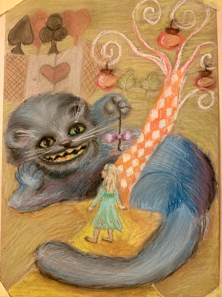Алиса шла к замку, как вдруг, перед ней появился Чеширский кот. Он перекрыл Алисе дорогу. Алиса растерялась, а кот широко улыбался и держал в лапе бант.