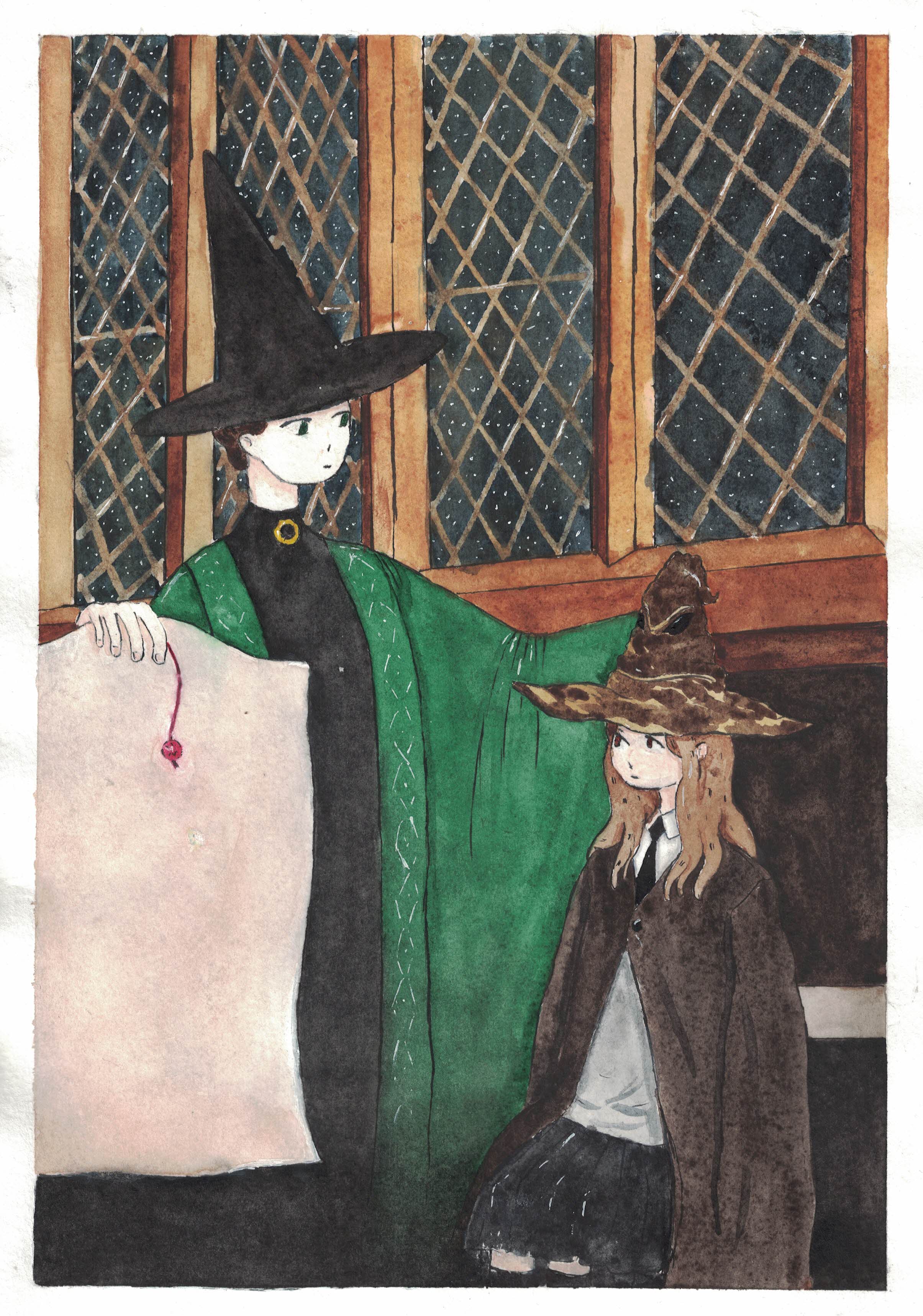 Я взяла за основу фрагмент книги, в котором рассказывается о том, как профессор МакГонаки вызывает учеников под шляпу Распределительницу. Звучит имя Гермионы Грейнджер, и она садится под шляпу.