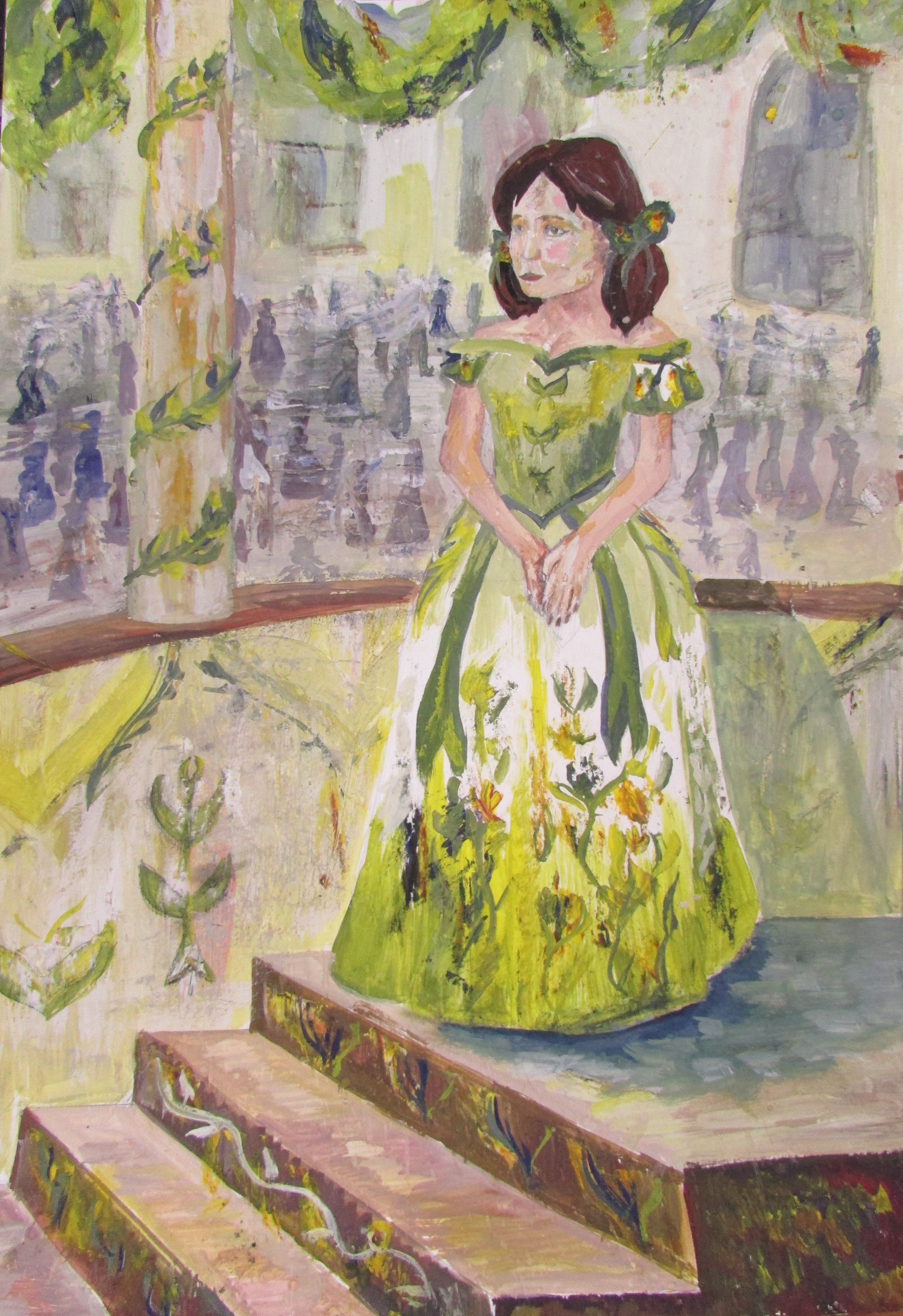 Скарлетт буквально боролась за это платье: его хотела надеть сестра Скарлетт, но их мама решила вопрос, предложив сестре свои украшения, а Мамушка (няня и служанка Скарлетт) считала его слишком открытым. Ведь леди не должны "выставлять грудь напоказ до обеда". Плюс она боялась, что из-за яркого солнца у девушки вновь появятся веснушки. Очевидно, Скарлетт считала это платье своим лучшим, ведь именно в нем она планировала признаться в любви Эшли.