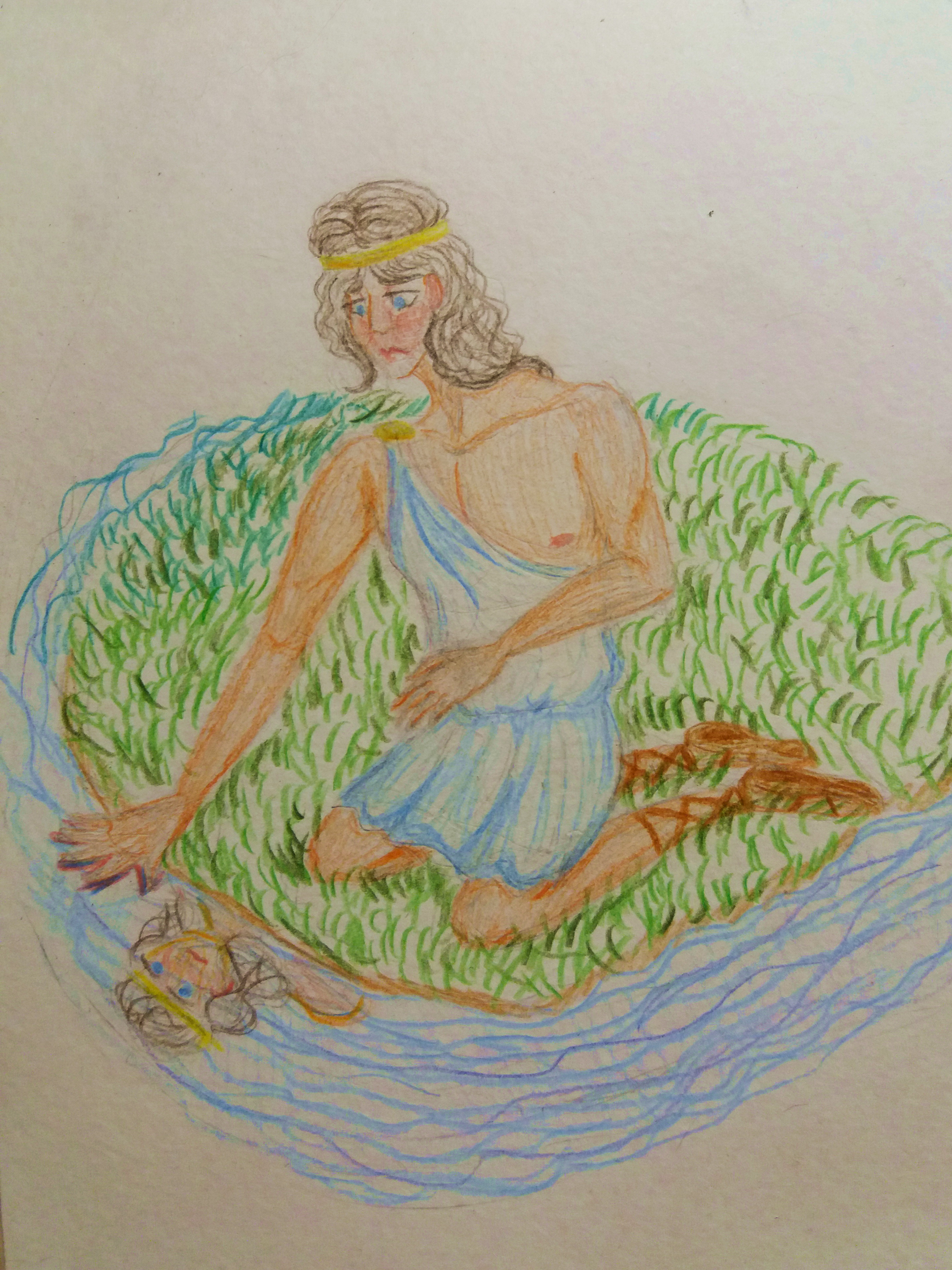 "И, точно прикованный какой-то чудесной силой, он глядел и не мог насмотреться на прекрасное лицо, не зная, что он полюбил себя самого".
