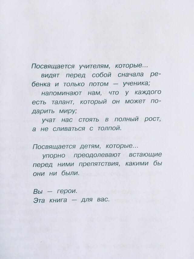 Сейчас у меня на прикроватной тумбочке лежит «Невероятный мир глазами загадочной Элли», Л.М. Хант. Только вслушайтесь в аннотацию: «Посвящается учителям…которые видят перед сбой сначала ребенка и только потом ученика; учат нас стоять в полный рост, а не сливаться с толпой. Посвящается детям, которые…упорно преодолевают встающие перед ними препятствия, какими бы они ни были. Вы-герои. Эта книга-для вас».