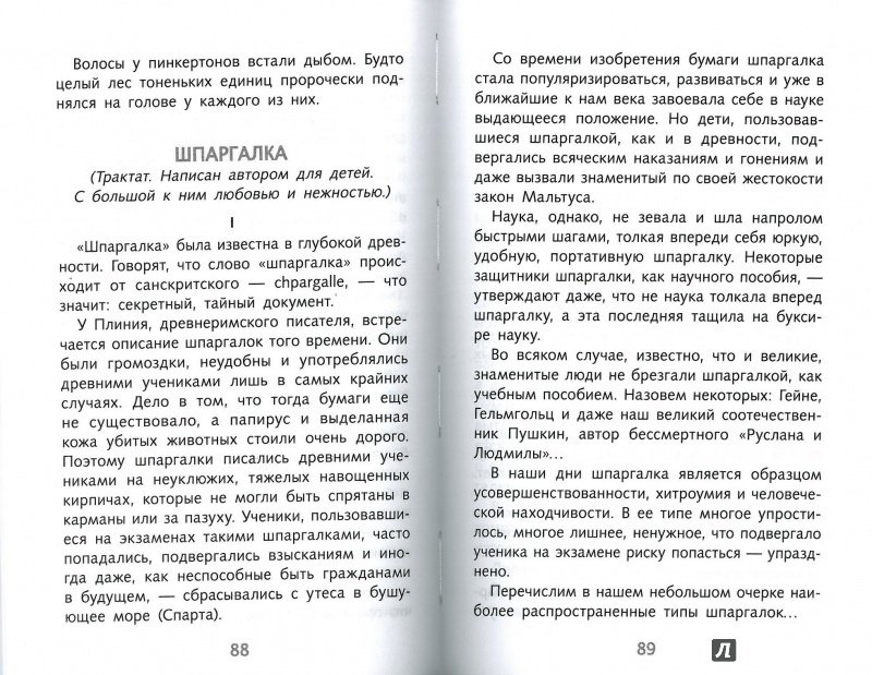И я её прочитала. Такое было чувство, будто читаешь книгу, написанную в наше время. С девятнадцатого века дети почти не изменились: не любят математику, а любят читать более интересные книги, любят покрасоваться перед друзьями. А великолепный трактат о шпаргалке открыл мне недоступные раньше средства подготовки к экзаменам.